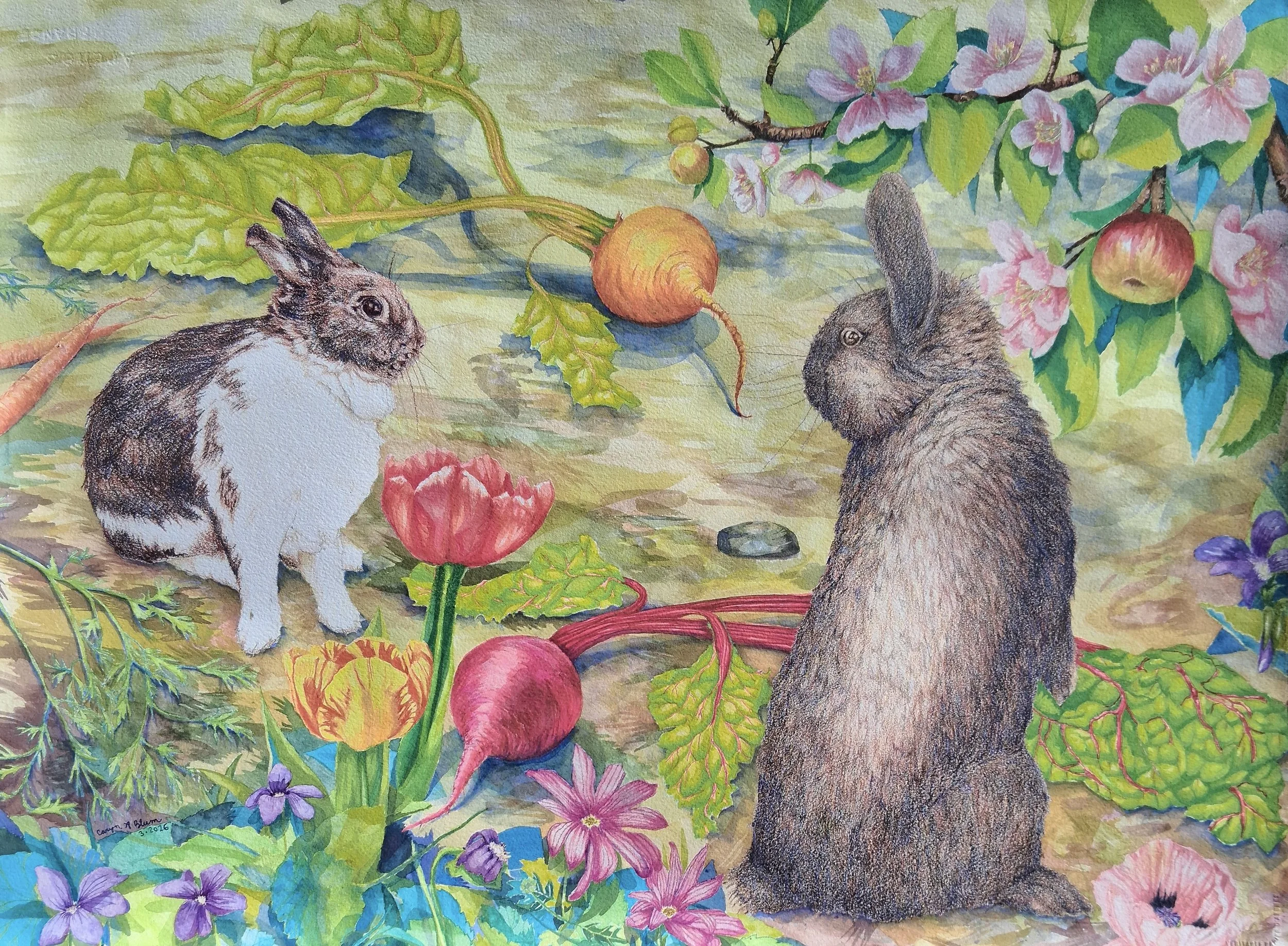 I create these amalgams as celebration of the natural world, and everyday phenomena and natural miracles in the environment. I grew up with large organic gardens, pet rabbits, and have enjoyed a lifetime of artistic expeditions between cultivated and wild landscapes. On hikes through northern coastal forests, wooded properties and state trails, I encounter stone staircases carpeted in mosses. Bent cedar and hemlock strain to catch the sun; and cooing blue jays and tanagers dance between aspen branches. Doves nest in my tomato plants. The rabbits chin and mark their favorite beet leaves. On a sunlit morning that paints millions of shades, I freeze like a deer watching. Lichen bubbles and flakes, pops of crimson, magenta, carmine and vermillion flowers hide amongst sap green ferns, and tree bark is an etched minimalist artwork. Columbine hover like lamps, wild peas and grapevines appear woven in mesmerizing detail. I search the ground for rebellious tree roots, and new species of flowers to paint. Brilliant colors of sunrise or sunset pour through open crevices between trees and rock.