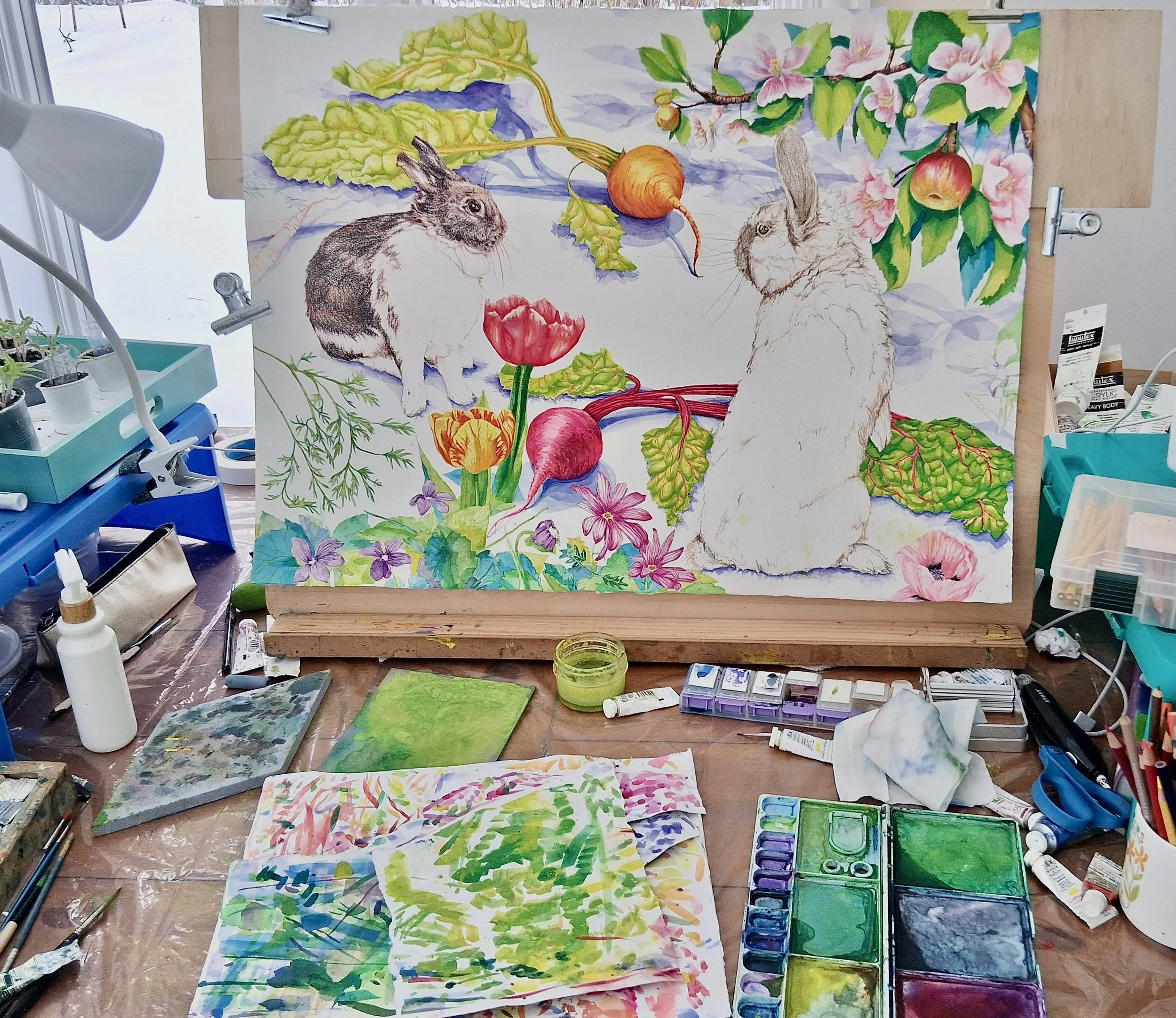 Every spring and summer, the land explodes visually, overlaying winter's cold palette with a supersaturated display of complimentary colors, velvety textures and diverse plant contours of fascinating ecosystems. Gardens burst, promising small miracles. If you slow down and enjoy taking time in nature; cranes, porcupines, thumbnail-sized toads and other spectacular wildlife will join you for moments. Some days I bring my painting case and sketchbook to set up a live session, cataloging all the colors and contours I observe. On other days, I bring my sketches to my art table. My imagination grows as wild and expansive as these forests as I use my paints and pencils to cultivate and curate a sense of harmony possible in nature.