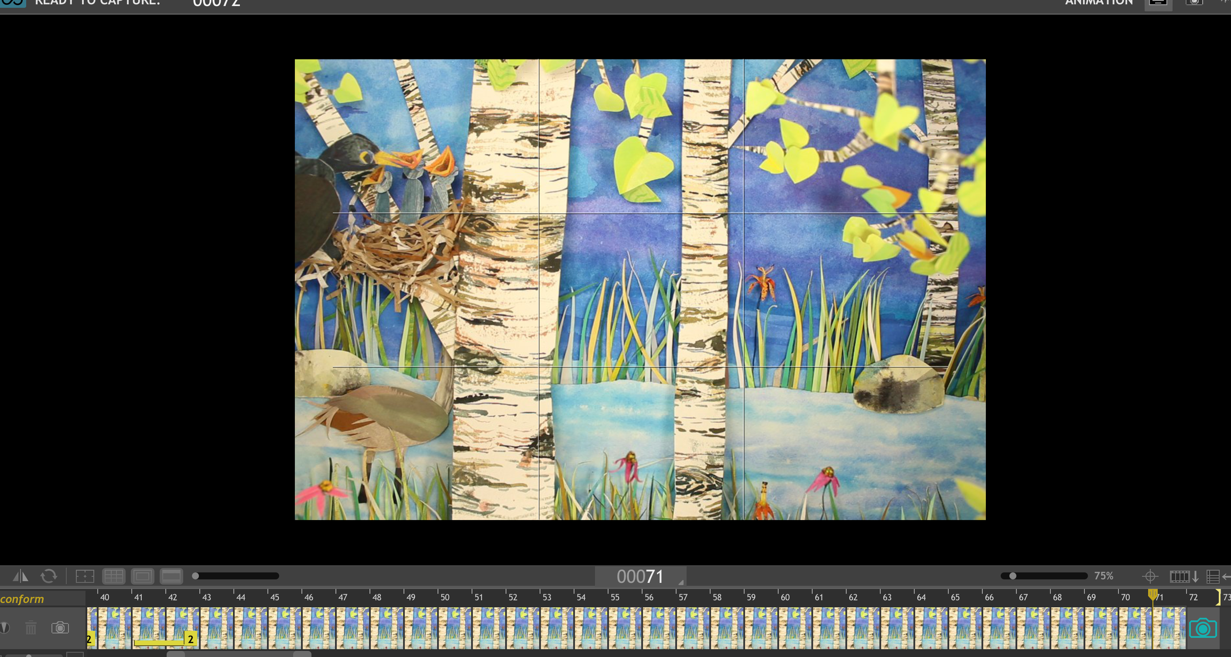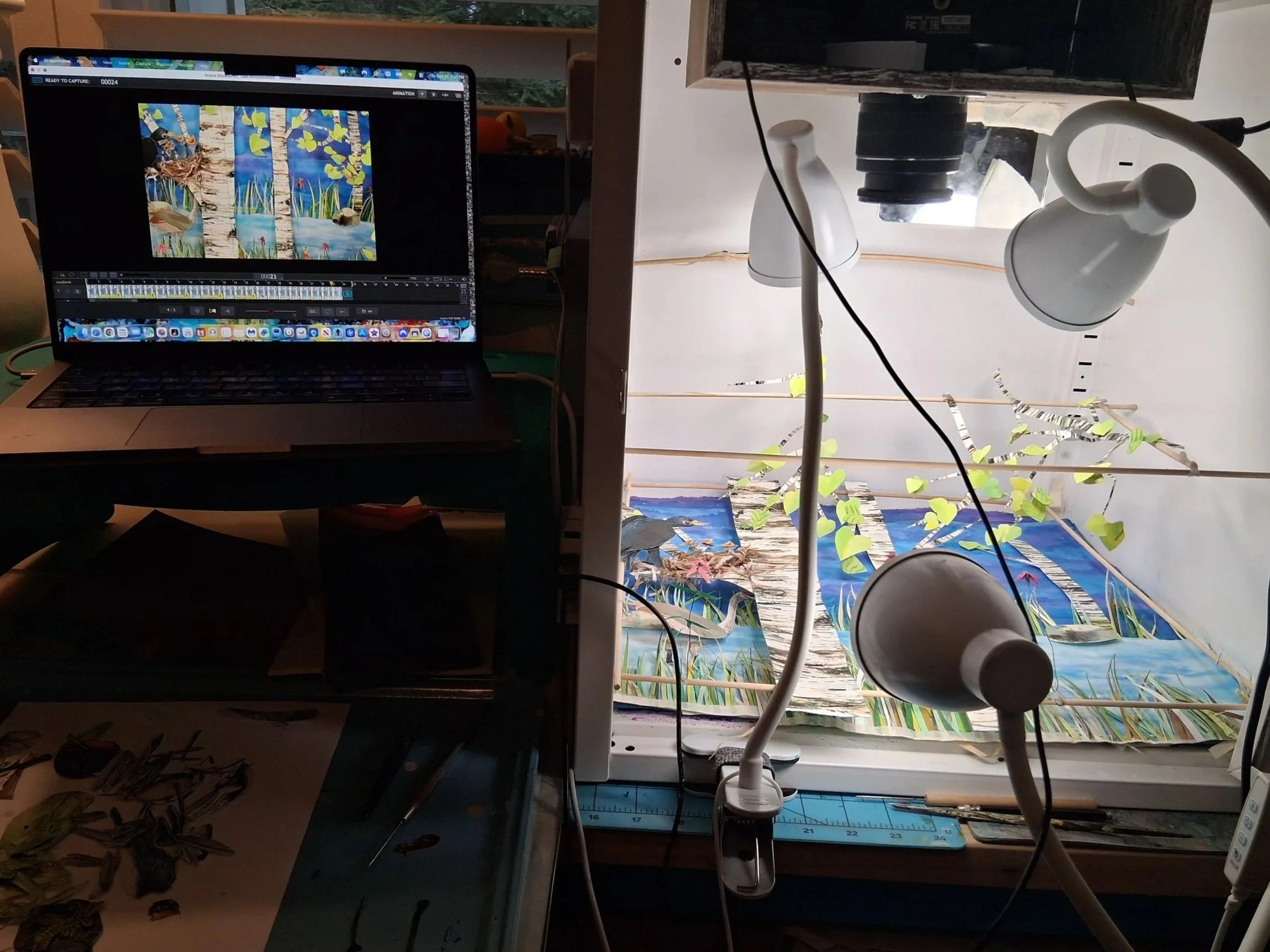 Each piece is shot with 2 side lights and a key light. I rigged a canon DSLR camera, and a digital microscope to my laptop with stop-motion animation software. The digital microscopes pick up more texture and detail in close range shots than even my DSLR can do with my standard manual lens.I I enjoy playing around with editing painted elements, clay sculpture and wire puppets, as I develop miniature animated shorts. I would never make live-action film, or film with people, and would not want to make these pieces into full-length feature animations. These are more for galleries, or virtual showings as samples for simple animation projects with my students. It is enough to explore movement in nature, multiple puppets moving at various speeds, and interesting sound components matched with movement. Each vignette is open-ended, and relates well to my nature-based and education based artworks. Each of these is simply a celebration or meditation on nature, and the acts of making or appreciating small elements in the natural world.